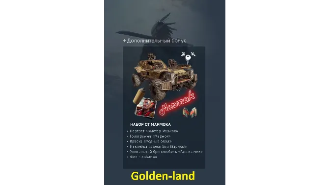 After purchasing the product, you will instantly receive a link to the Additional Bonus - "Set from Marmok" to your Crossout account.