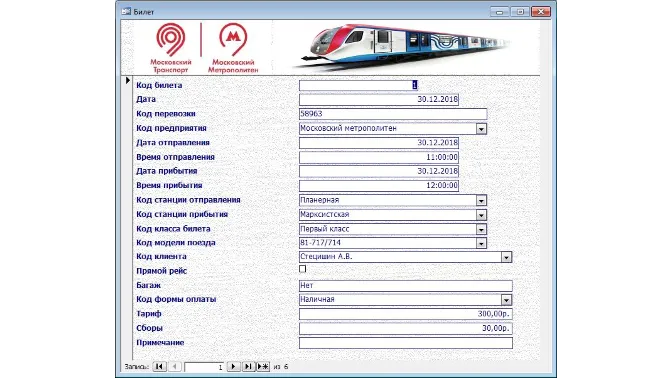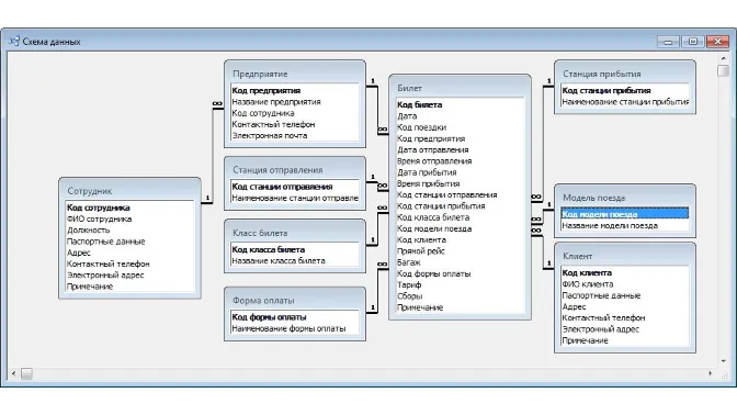База данных "Касса метрополитена"содержит следующие таблицы: компания; сотрудник; клиент; модель поезда; станция отправления; станция прибытия; класс билета; форма оплаты; билет.