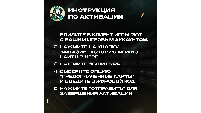 Кто мы? Робин Гуд ШОП - ваш надежный проводник в мир любимых сервисов и подписок!🏹<delivery> ⭐️🎮 Riot Access Code дает вам специальные предметы в играх, таких как League of Legends или Valorant, созданных Riot Games. Их можно получить в рамках акций или событий, а игроки используют их для получения вознаграждений, таких как скины или чемпионы.</delivery>